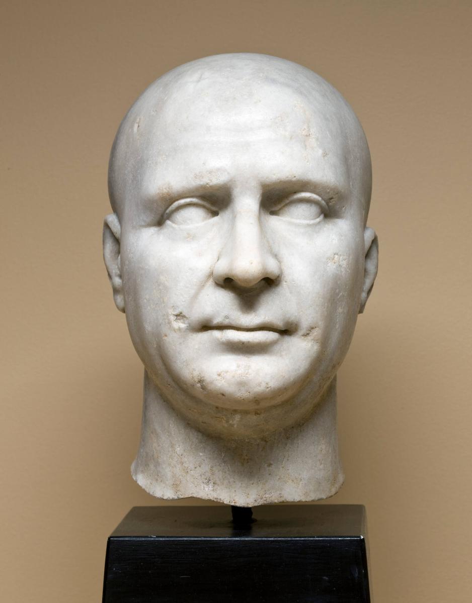 On viewThis man’s baldness and the “x” mark on his forehead likely mean that he was a priest of the Egyptian goddess Isis, who was worshiped across the Roman world and was associated with concepts like the cosmos, motherhood, and seafaring. Devotees to Isis underwent special initiation rituals led by priests and were guaranteed an afterlife. By contrast, the afterlife was ambiguous and not assured for Romans outside of these specific cults. This priest was likely wealthy, with the means to commission a marble portrait, though the priesthood of Isis was open to more socioeconomic classes than those of other Roman gods.