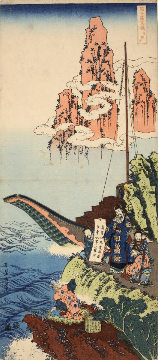 Not on viewA gentleman in Chinese clothes with two attendants seems to have just come ashore from a Chinese-style boat. Mountains ringed with clouds in the style of a Chinese landscape emerge from the sea in the distance. This print depicts a scene from the nō play Hakurakuten, which imagines a meeting between the Chinese poet Bái Jūyì 白居易 (772–846), known in Japan as Hakurakuten, and the Japanese god of literature, Sumiyoshi Myōjin, who is disguised as a fisherman.