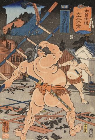 Sekigahara: Outdoor Battle between the Wrestlers Hanaregoma Chokichi and Nuregami Chogoro, no. 59 from the series The Sixty-nine Stations of the Kisokaidō