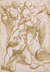 In the 1570s, Cambiaso executed fewer public commissions and more devotional works for private patrons, depicting evocative nocturnal religious scenes, and other subjects, presented in a simplified style. His interest in Counter-Reformation art may have been stimulated by Jesuit spiritual practices and a visit to Rome in 1582. In 1583 Philip II of Spain invited Cambiaso to Madrid, as a result of an altarpiece the artist had sent from Genoa to the Escorial, a monastery and royal residence, in 1581. In Spain he was mainly occupied with the decoration of the church of San Lorenzo in the Escorial. He died in Madrid two years later and was buried there.