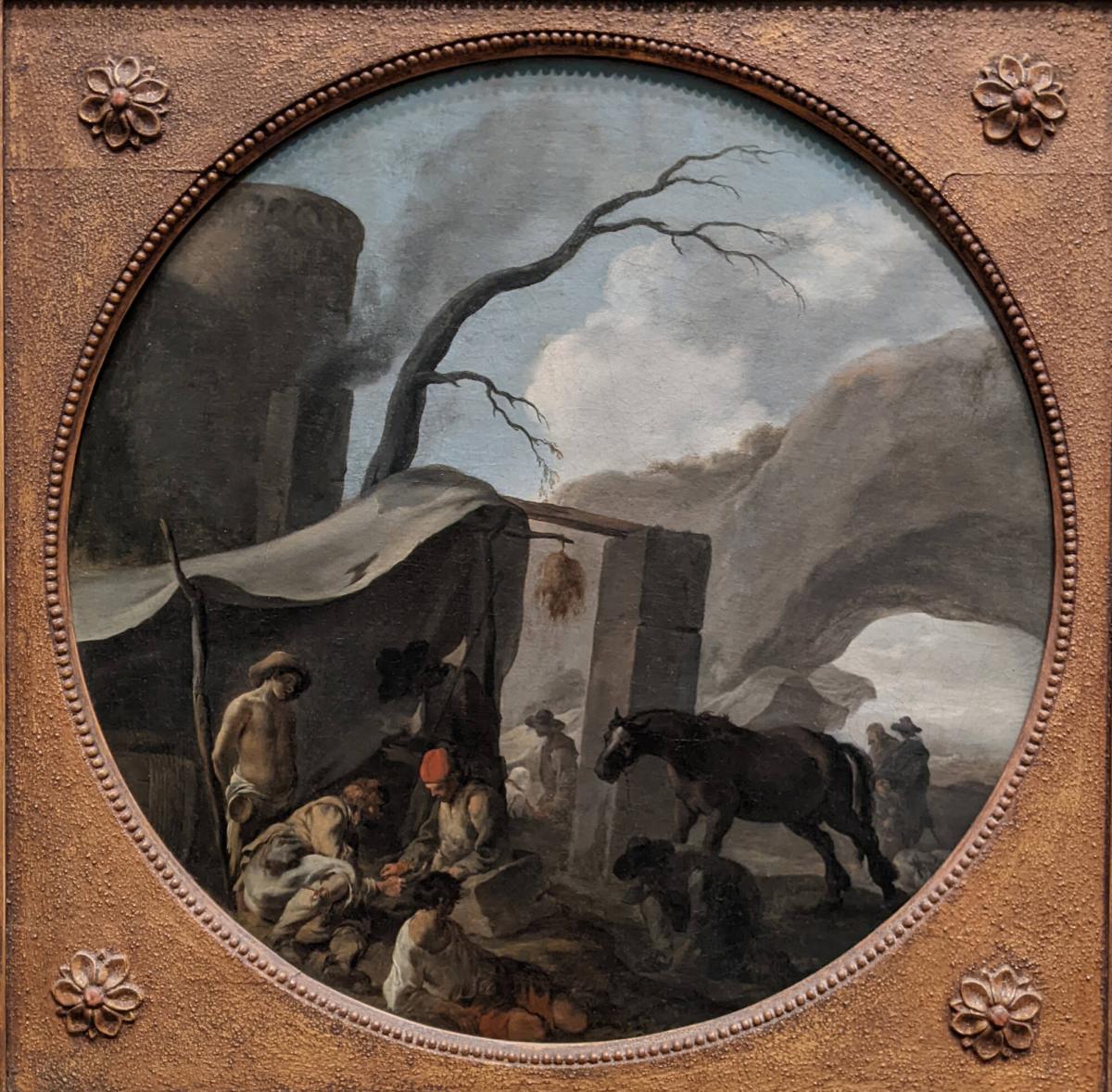 BiographySébastien Bourdon was born in 1616 to Protestant parents living in Montpellier. He was apprenticed to a painter in Paris from age seven to fourteen (1623-30), and worked in France until his arrival in Rome in 1636, 8 where he gained a reputation as a painter of bambocciante. Bourdon was forced to flee Rome in 1638 to escape denunciation by the Inquisition for his Protestant faith. Following his return to Paris Bourdon continued to paint Italianate genre scenes, but after about 1640 the influence of Nicolas Poussin (1593/4-1665) became more pronounced in his works, as evidenced in their geometric compositions, clearly-defined planes, and brighter palette. In 1648 Bourdon was one of the founding members of the Académie Royale de Peinture et de Sculpture, and was named rector of the Académie in 1654. Bourdon painted primarily history scenes, but also executed landscapes, portraits, and numerous large-scale decorative works, as well as a few genre scenes.