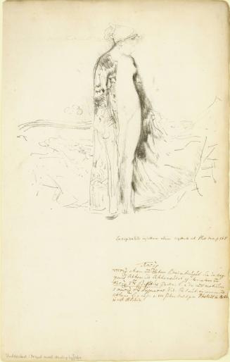 Whistler first became interested in printmaking when he encountered the prints of Hogarth and Rembrandt as a child in the home of his brother-in-law Francis Seymour Haden. His own oeuvre as a printmaker is large, innovative, and highly influential. His first published portfolio of etchings--Twelve Etchings from Nature (the so-called "French Set," published in Paris in 1858 and in London in 1859) includes a somewhat eclectic group of images executed in London and rural France, as well as scenes of Parisian life. The next, more coherent set--A Series of Sixteen Etchings of Scenes on the Thames and Other Subjects (the so-called "Thames Set")--is a rich portrait of the docks of the Thames as they existed in 1859. After making a few individual etchings in the early 1860s, Whistler stopped making prints until after the 1871 publication of the Thames Set. When he returned to etching, it was with a new-found sense of pictorial structure and tonalist vision, rather than the earlier attention to descriptive detail. The two Venice sets (drawn on the plates in 1879-80, see Main Text) that resulted are the apex of his printed oeuvre. Whistler went on to etch many individual prints in addition to the "Amsterdam Set" of 1889. He also learned lithography, making a series of lithotints in the 1870s and several sketchlike litho transfer prints (see Mother and Child, AMAM inv. 53.211) in the 1890s, including five ambitious color prints.