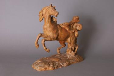 De Chirico's theoretical writings of 1910-20 stress the importance of time and memory in the creation of art, seeking renewal in the use (rather than the rejection) of history. An historical element permeates his entire oeuvre, from the metaphysical paintings of 1910-20 to the neoclassicist constructs of the 1920s, and his many copies and interpretations of old masters. De Chirico returned to Paris in 1924, where his work was especially influential for the Surrealists. In Italy during the 1940s, de Chirico turned to more conservative subject matter, and toward the end of the decade affected a lush, painterly, neo-baroque style influenced in part by his study of old masters. His reuse of earlier styles and motifs in paintings of the 1940s and later (including copies of some of his most famous works) was roundly criticized, as it was felt to be deceptive chronologically, and hence in terms of value. The artist defended himself by declaring that both the concept and execution of the works were his own, and the date of execution therefore immaterial.8 De Chirico worked in a variety of media well into old age, producing theater designs, illustrations and color lithographs, and sculpture, in addition to paintings.